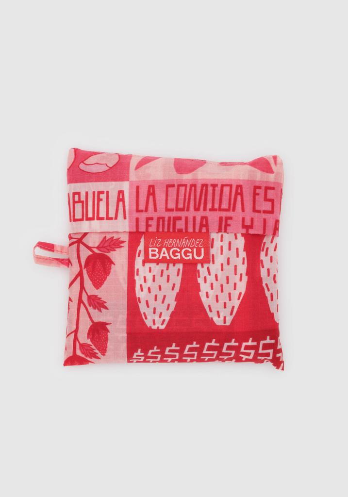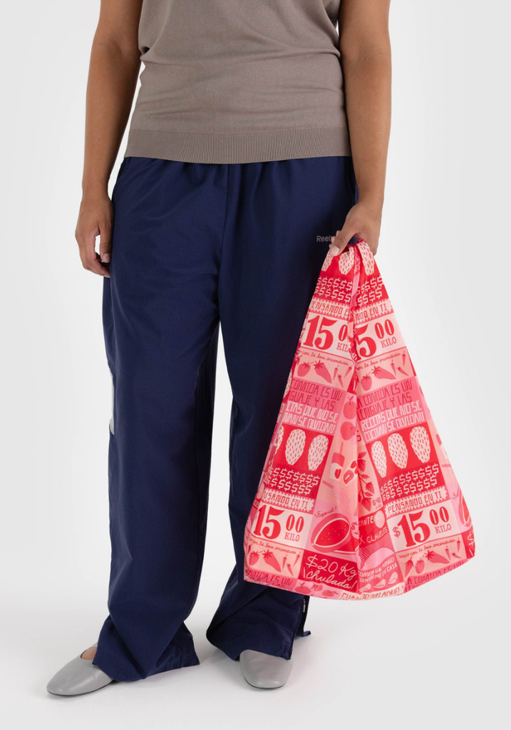 The Mercado bag draws inspiration from the Tianguis, the pop up markets that fill the streets of Mexico City with their pink tents and striking handmade signs. The bag features Liz’s interpretation of these signs, communicating food’s relationship to subjects like family and home.