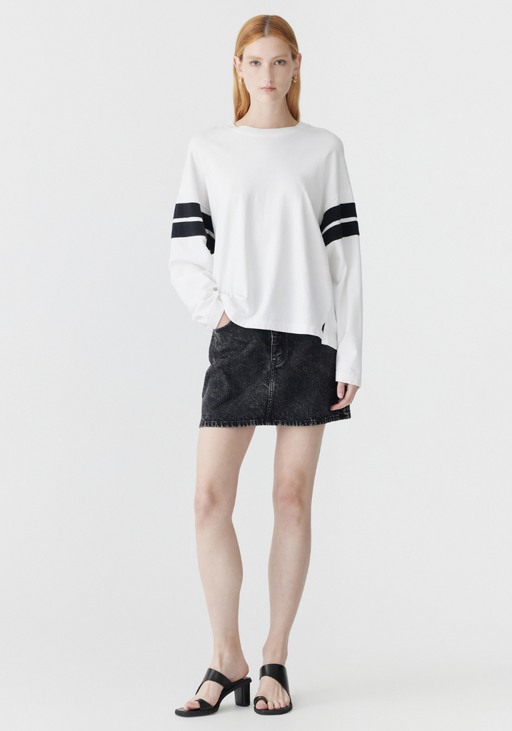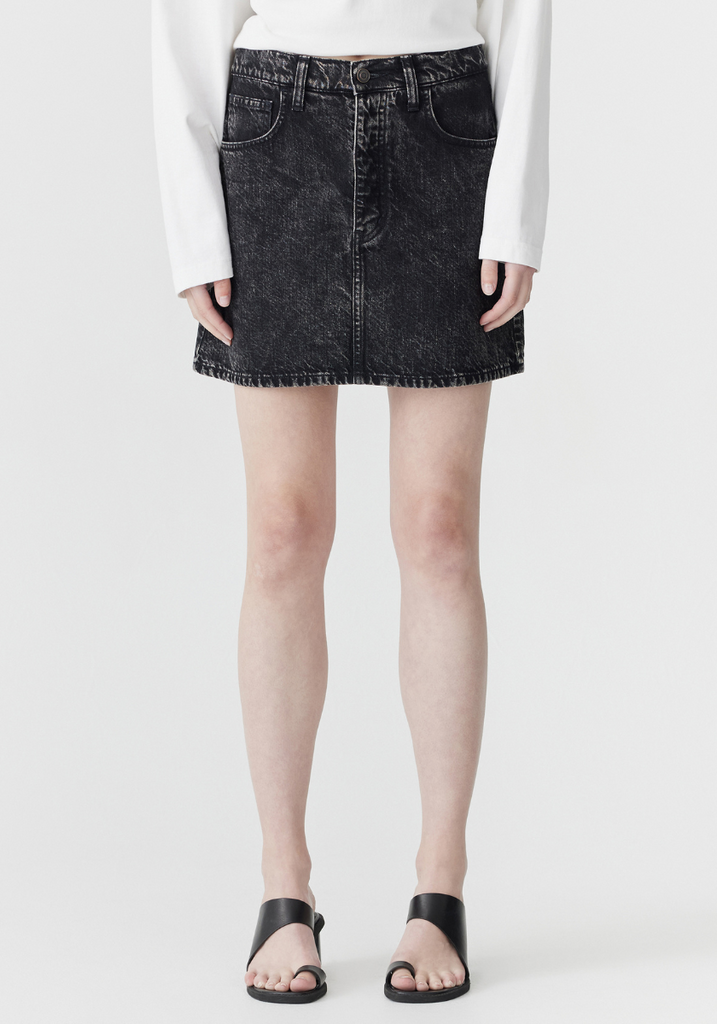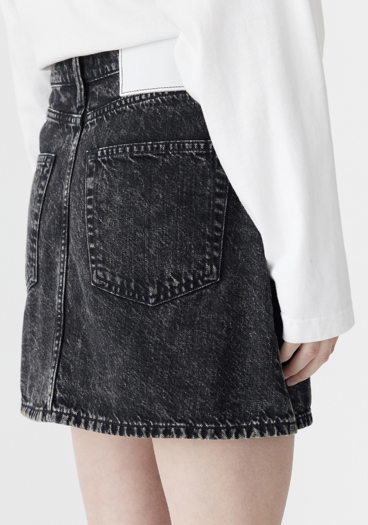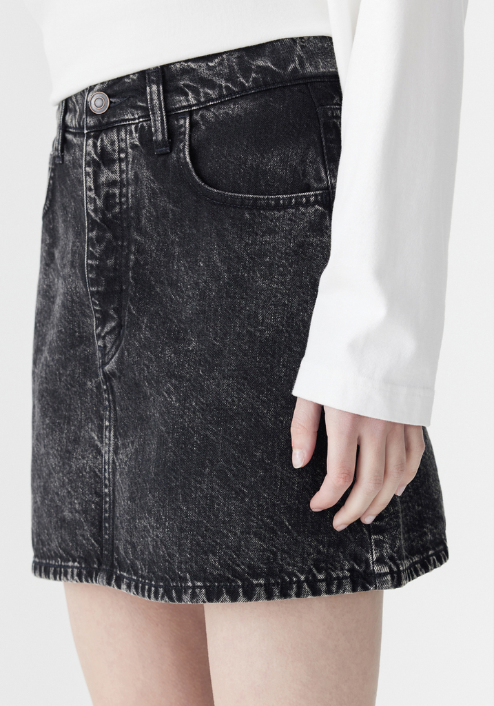 Crafted from Japanese midweight organic cotton denim twill, the Motley Denim Mini Skirt is designed for a high-waisted silhouette in a regular fit. This classic style features traditional five-pocket detailing and an all-over denim make in a black ice motley wash. Finished with a Bassike denim shank button at centre front, concealed button fly, self belt loops and back patch pockets.