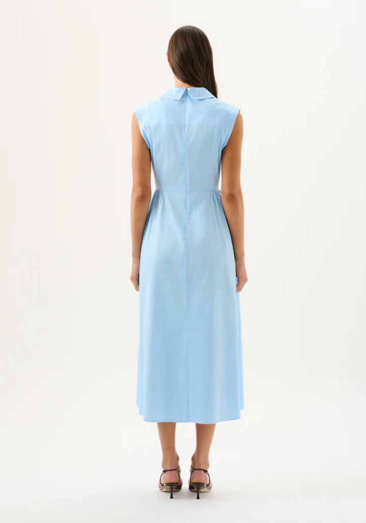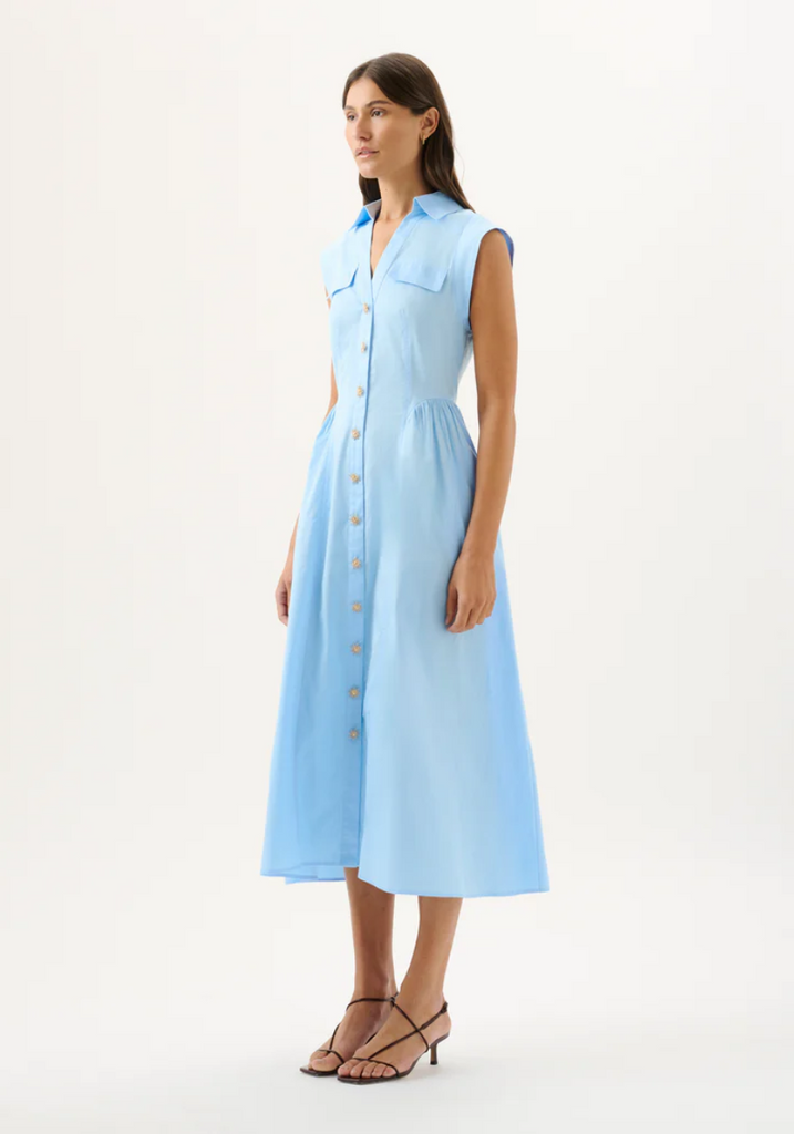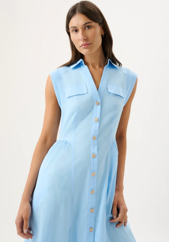 The Skylar Dress combines elegance with everyday ease. Featuring a classic collar, custom sun motif button front, and a softly cinched waist for a flattering silhouette. Finished with an invisible back zip and a flowing midi-length skirt, it’s a modern take on a timeless shape.