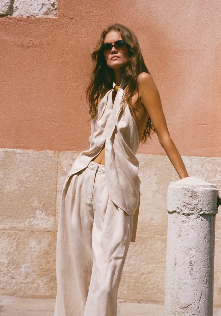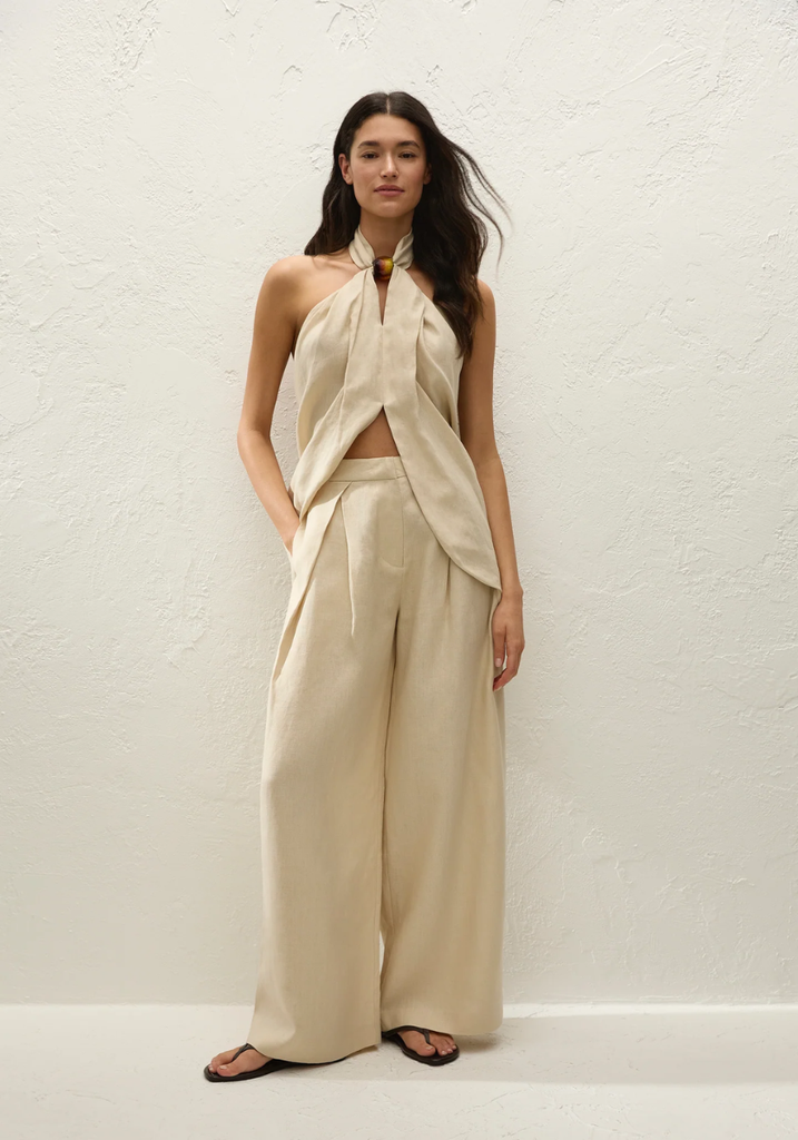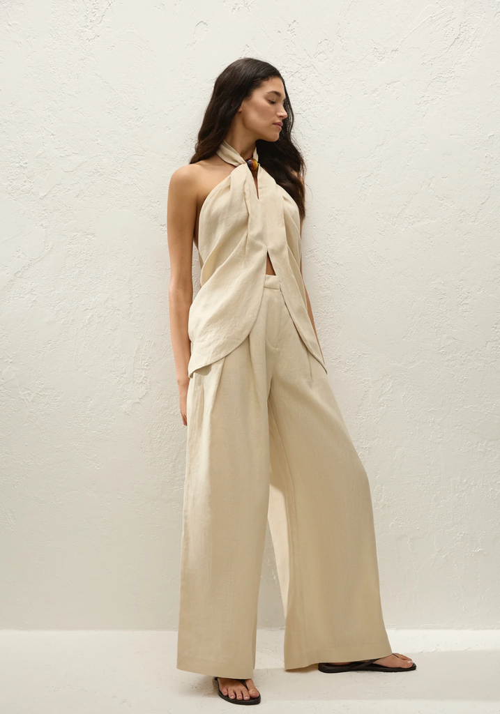 A halterneck top, designed from a signature 100% European Flax® linen in a warm neutral. Sitting high at the front deck, decorated with an oversized resin bead detail, it features an open back with a wide tie detail. The hem is curved, and is cut high through the front bodice, showing subtle skin. Style over the matching Sofia Trouser for refined yet relaxed vacation dressing.