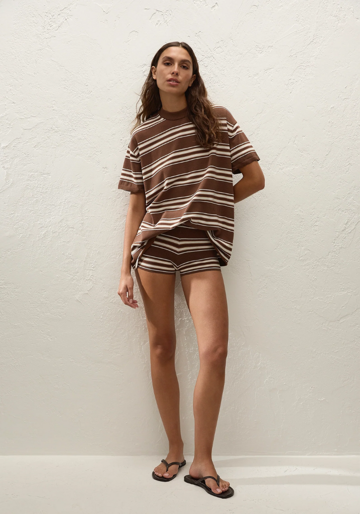 A mid-rise mini short, designed from a unique blend of cotton and viscose in a chocolate brown stripe. Designed to sit comfortably on the hips, they are a fitted silhouette that crop short on the body with a ribbed waistband and hemline. Style with the matching Le Paz Top for effortless, everyday appeal.