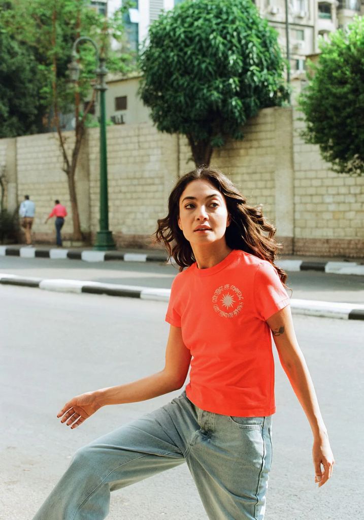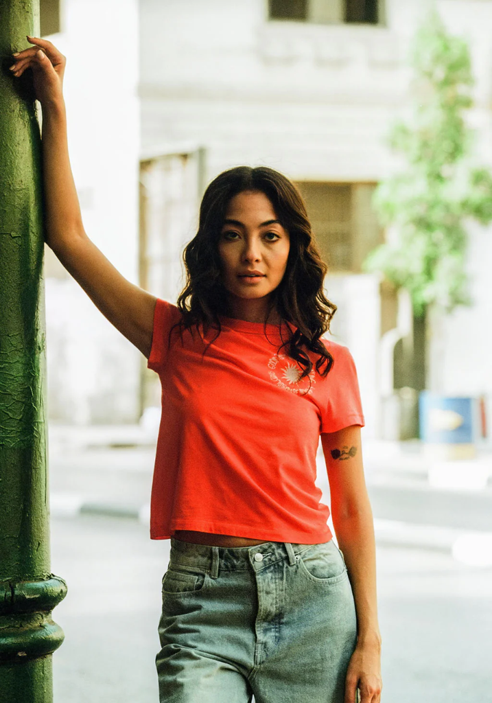The kind of throw-on piece that instantly lifts your mood. Made from soft cotton jersey in a bright, punchy coral, it features a small circular chest graphic reminding you that good things are coming.