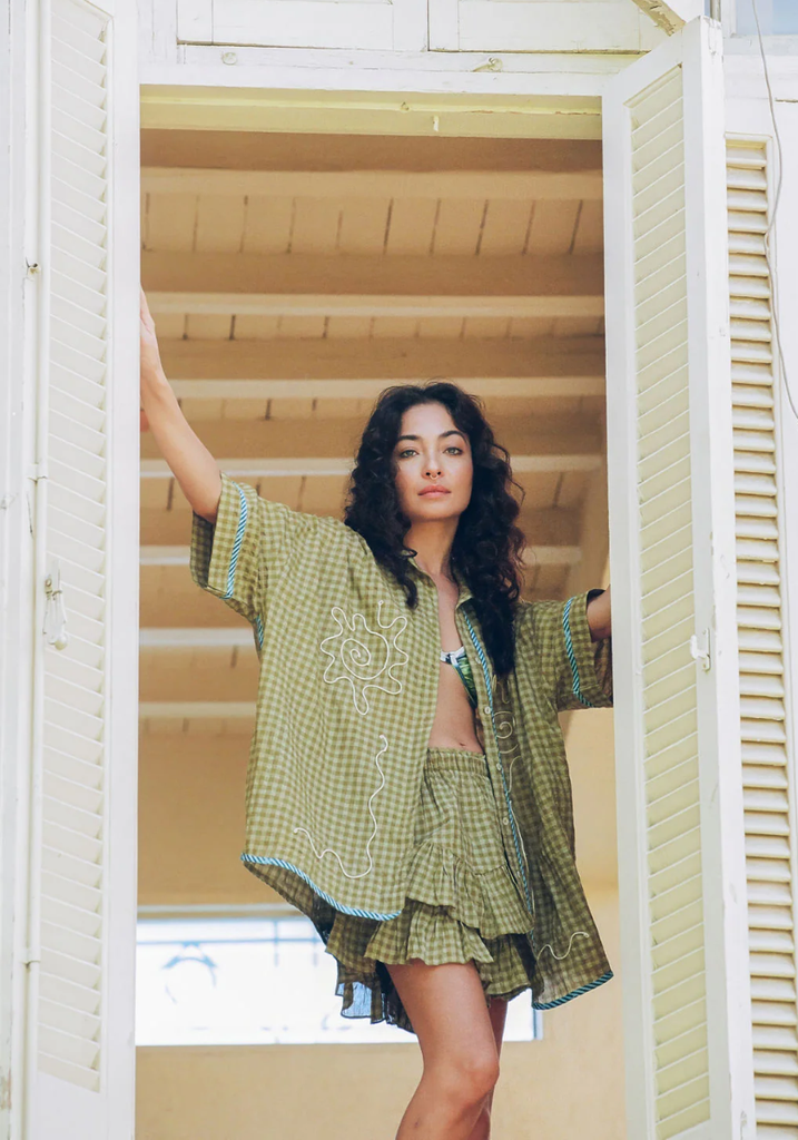 Cut in a soft olive gingham, it features layered frills that move beautifully, an elastic waist for all-day comfort, and a lightweight feel perfect for warm weather wandering.
