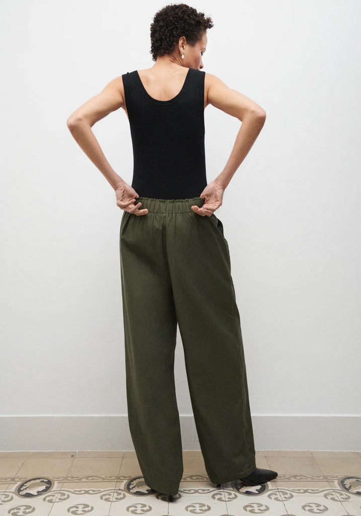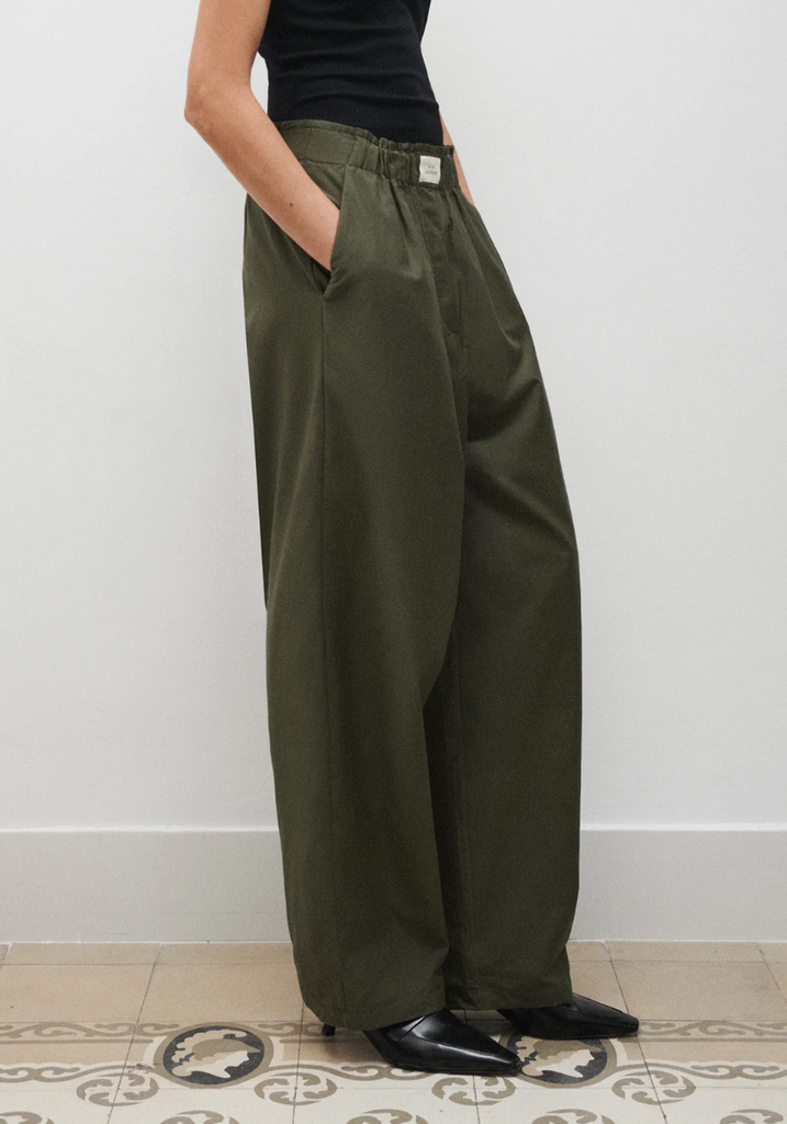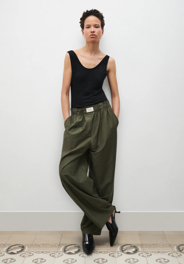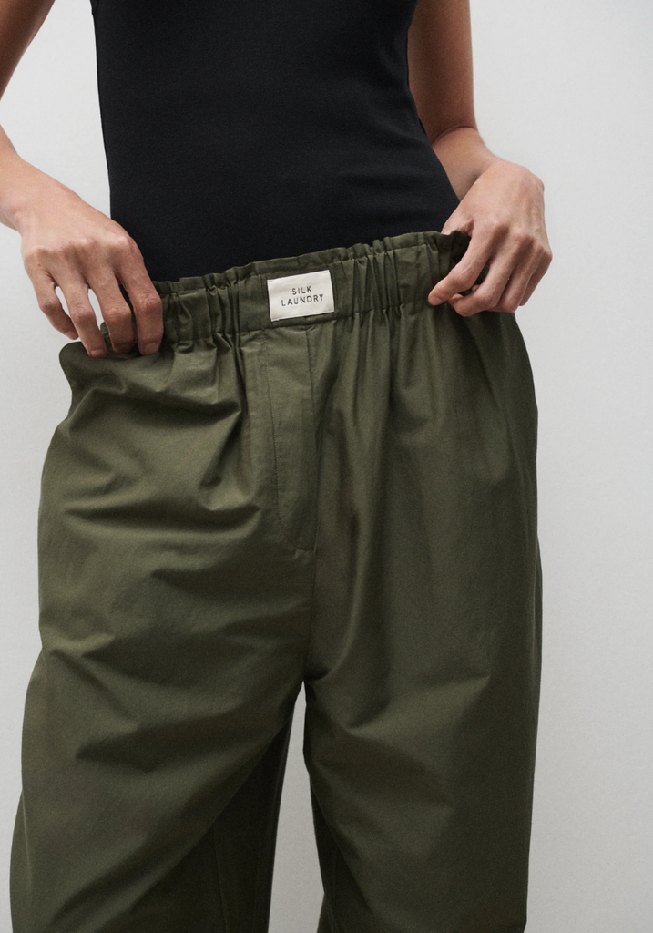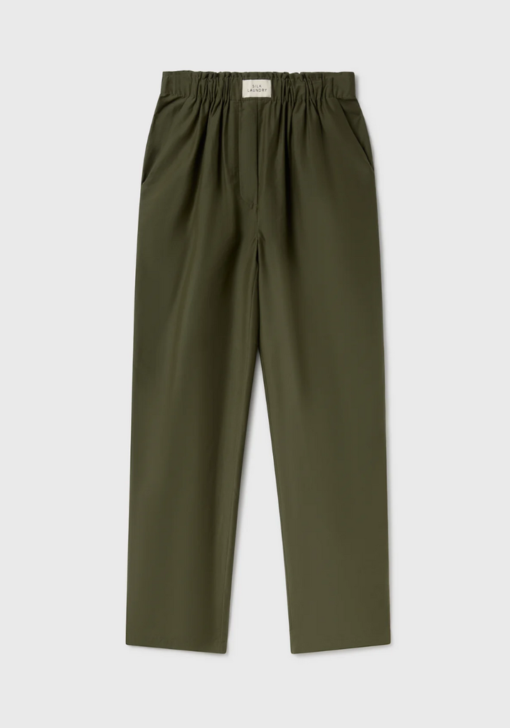 Silk Laundry Cotton Silk Paper Bag Pants feature a straight-leg design with an elastic waistband for a relaxed fit. Complete with side pockets and a full lining for comfort. Made from 75% Cotton 25% Silk.