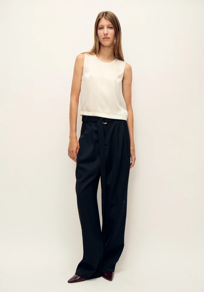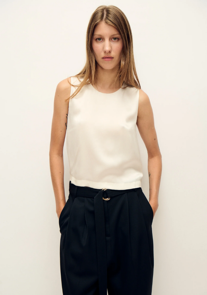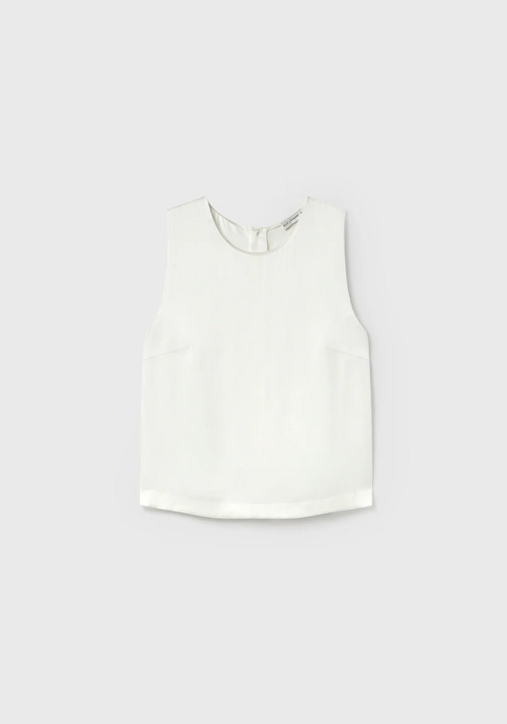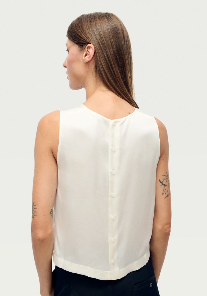 Silk Laundry Elena Top, made from 100% silk. Sleeveless, featuring a round neckline and bodice darts. Finished with button-down back.