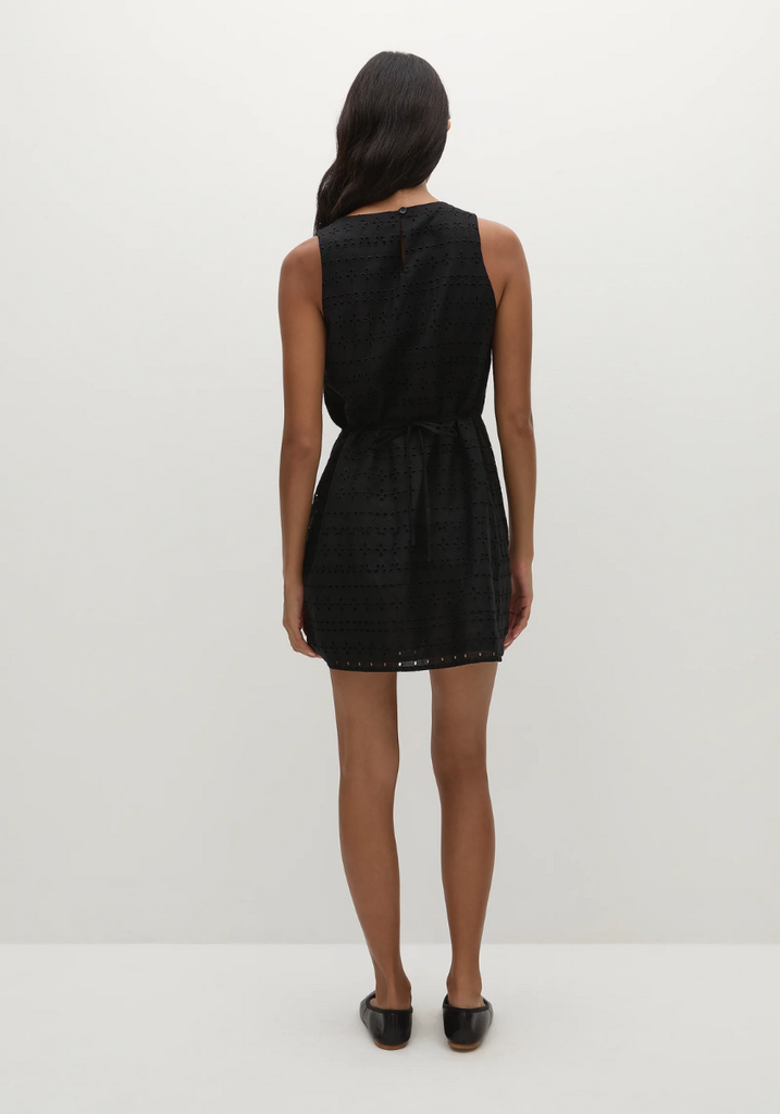A babydoll-inspired mini dress with a classic boat neckline and sleeveless bodice. It cinches in slightly at the waist with a back tie detail, before flaring into a soft A-line skirt that crops short on the body. There is also a keyhole button closure at the back neck. Designed from a new black anglaise broderie cotton blend, wear with a simple ballet flat for elevated everyday dressing.
