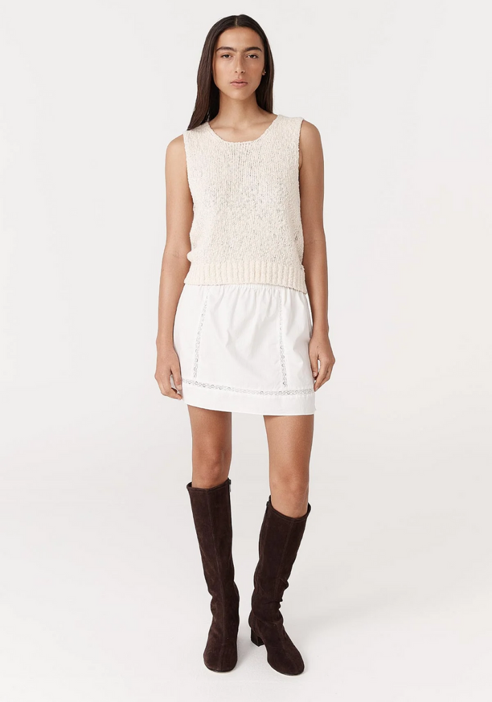 A mini with subtle romance. The Suri Skirt in Bone is cut from mid-weight cotton with lace insert detailing and an elastic waist designed to sit low or high.