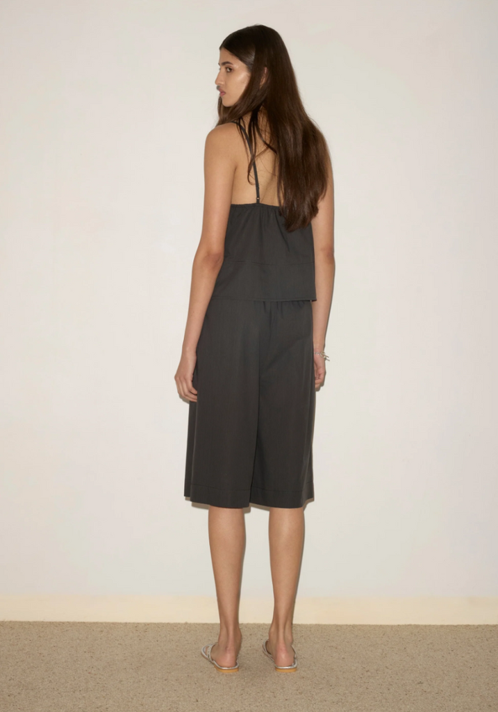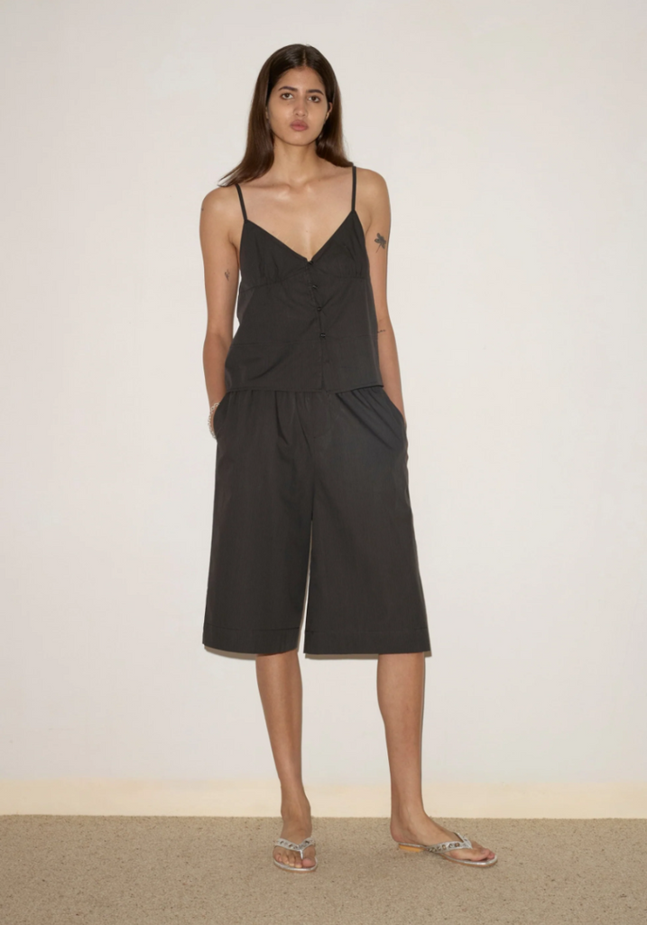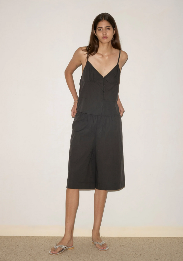 an easy pull-on, long line boxer featuring button detail at front placket and a gathered elastic waistline for a relaxed fit