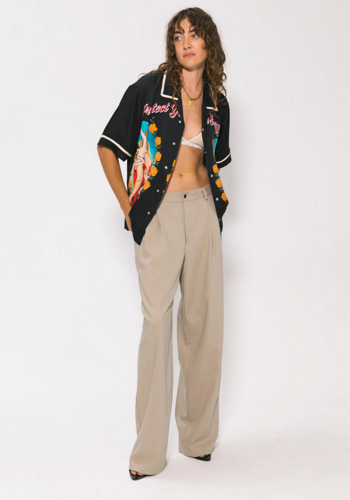 The Stone Westwood Pant brings a relaxed fit with four front pleats for structure & stud closure and zip fly. They are made from a fabric blend and feature front and back pockets, a contrast inner waistband, silver D-ring detail, and a tonal embroidered logo on the waistband.