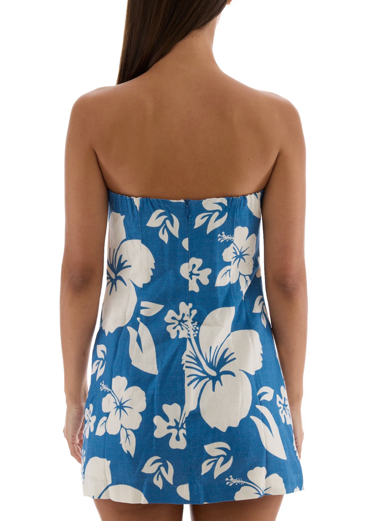 The Summer Mini Dress in Blue/White features a breezy, relaxed fit with a vibrant, tropical print. Its lightweight fabric and mini length make it perfect for beach days or casual warm-weather outings. Fully lined for comfort and a polished silhouette.