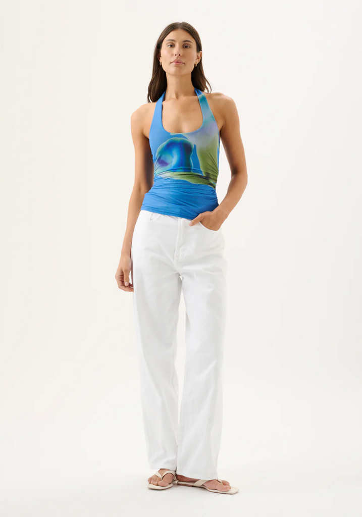 Elevate your wardrobe with the Thea Top in our exclusive Moonlit Lily print. A flattering scoop neckline, ruched waist, and halter tie detail create a modern feminine silhouette.