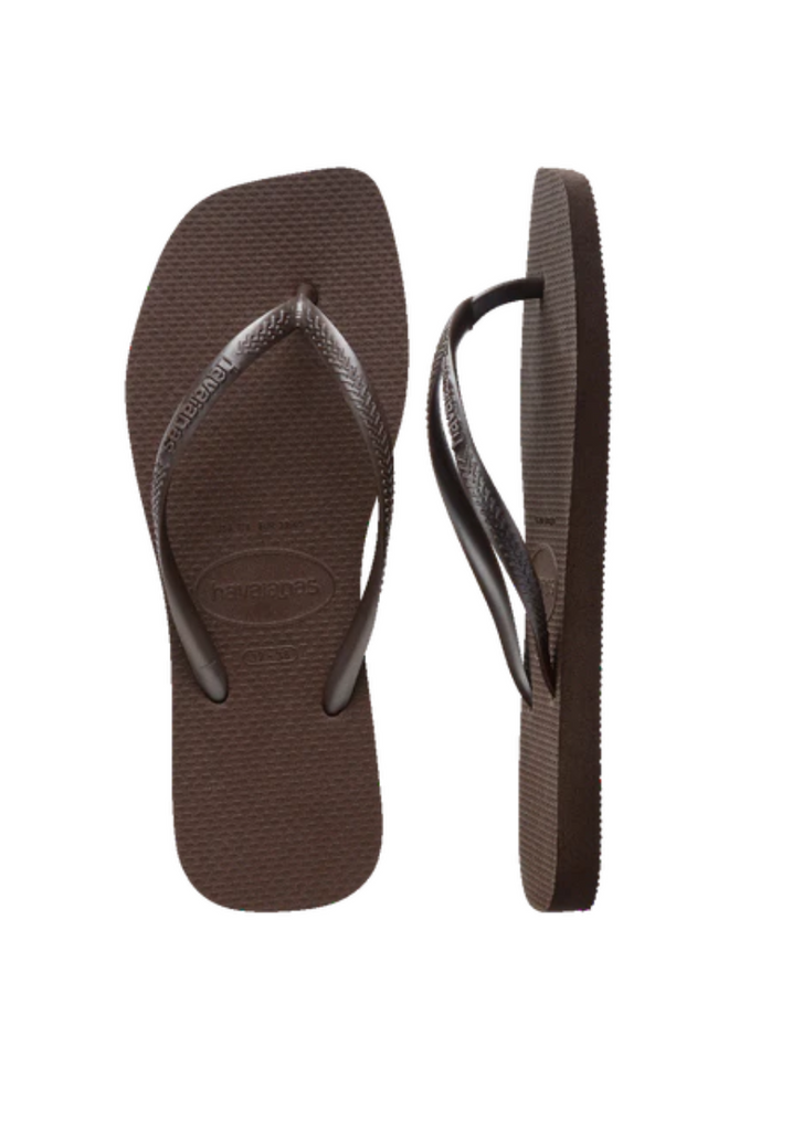 Introducing the Havaianas Slim Square Logo Pop-Up Thongs in Dark Brown.
