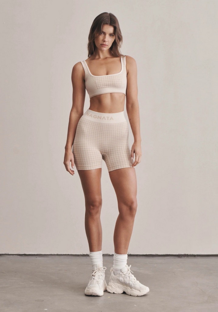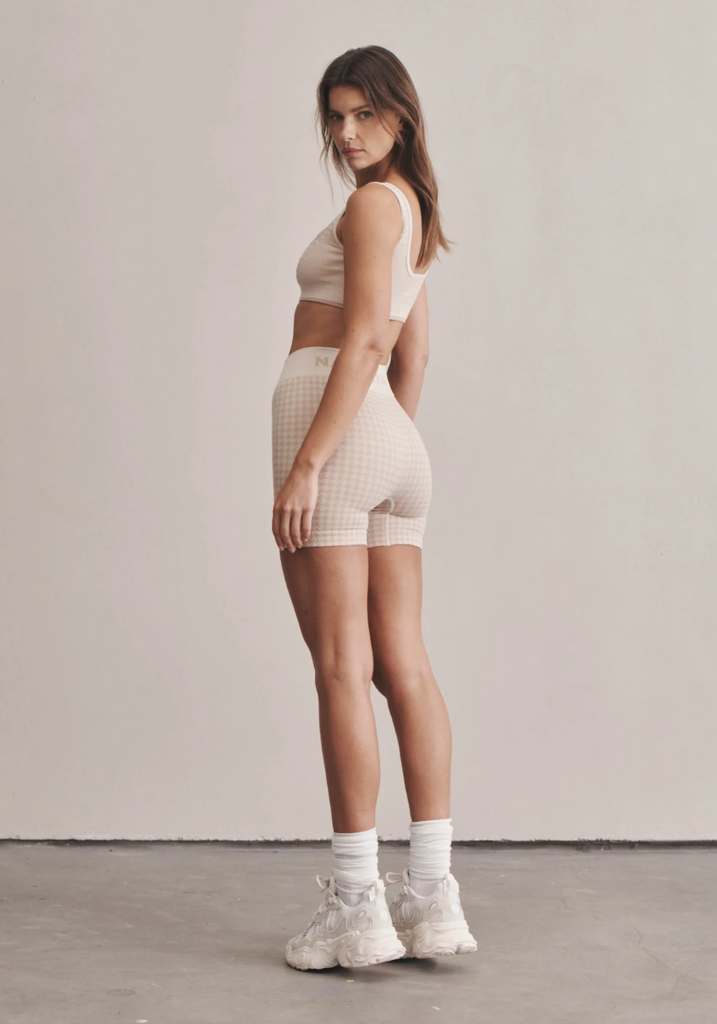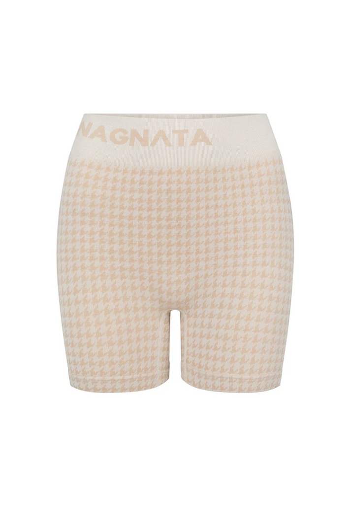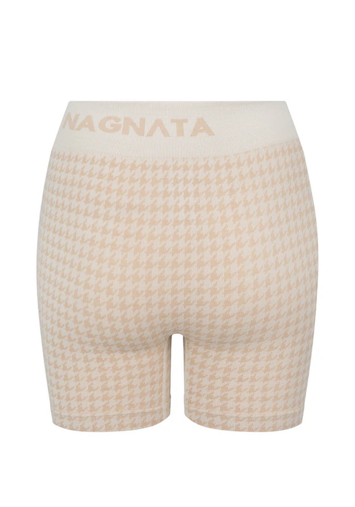 Superfine high-waisted Merino wool seamless knit rib mini short made in our signature seamless fabrication offering mild compression for support and breathability. The style is complemented by a double layer waistband with jacquard Nagnata logo on the back waistband. Crafted in our signature Nagnata rib, these shorts feature the iconic Nagnata houndstooth jacquard artwork.