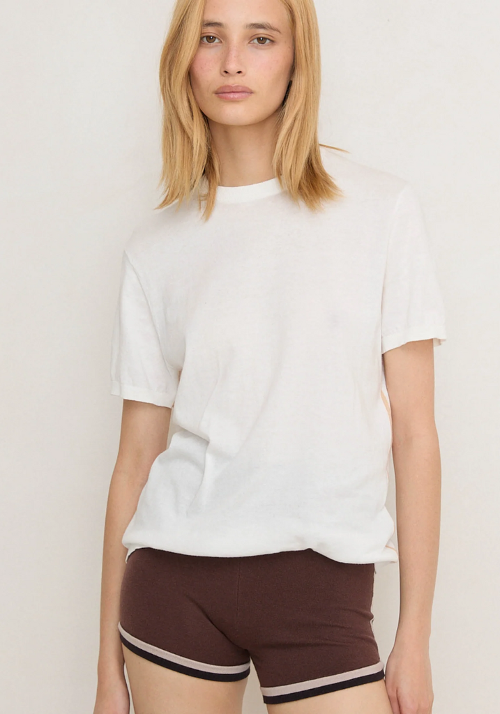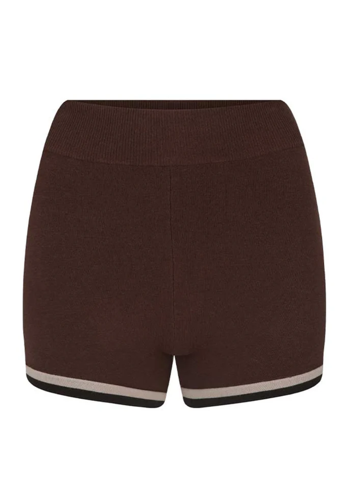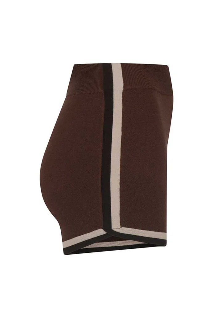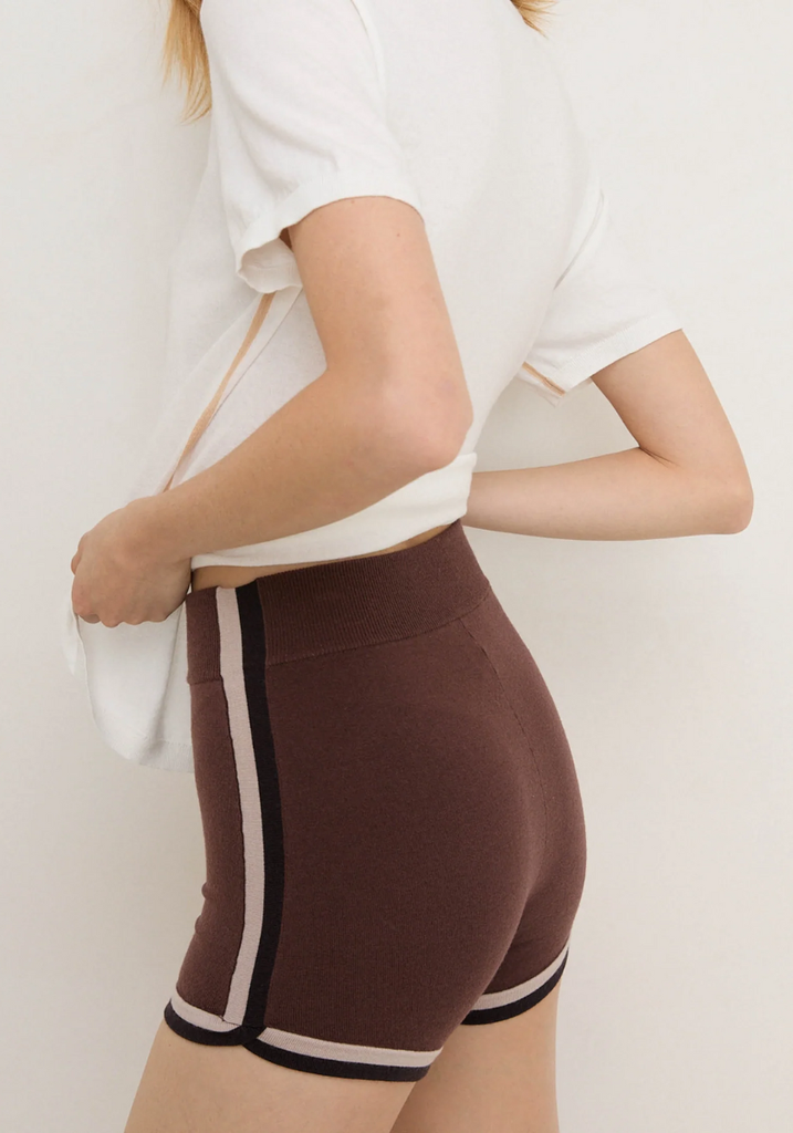 • Fitted mini short with intarsia side and hem stripe