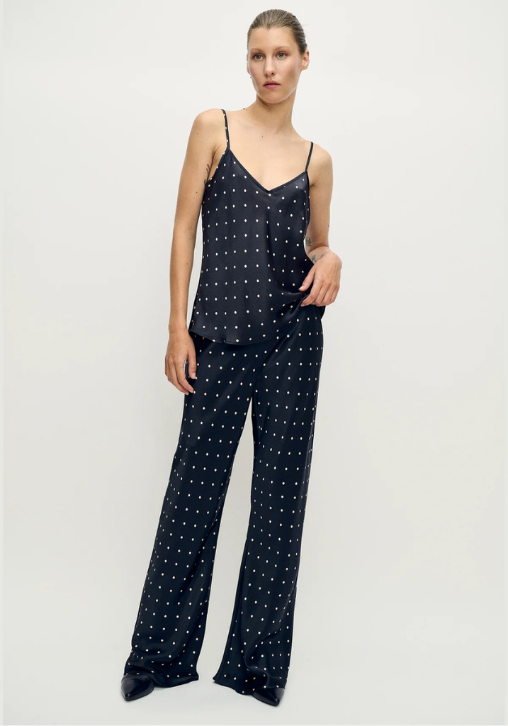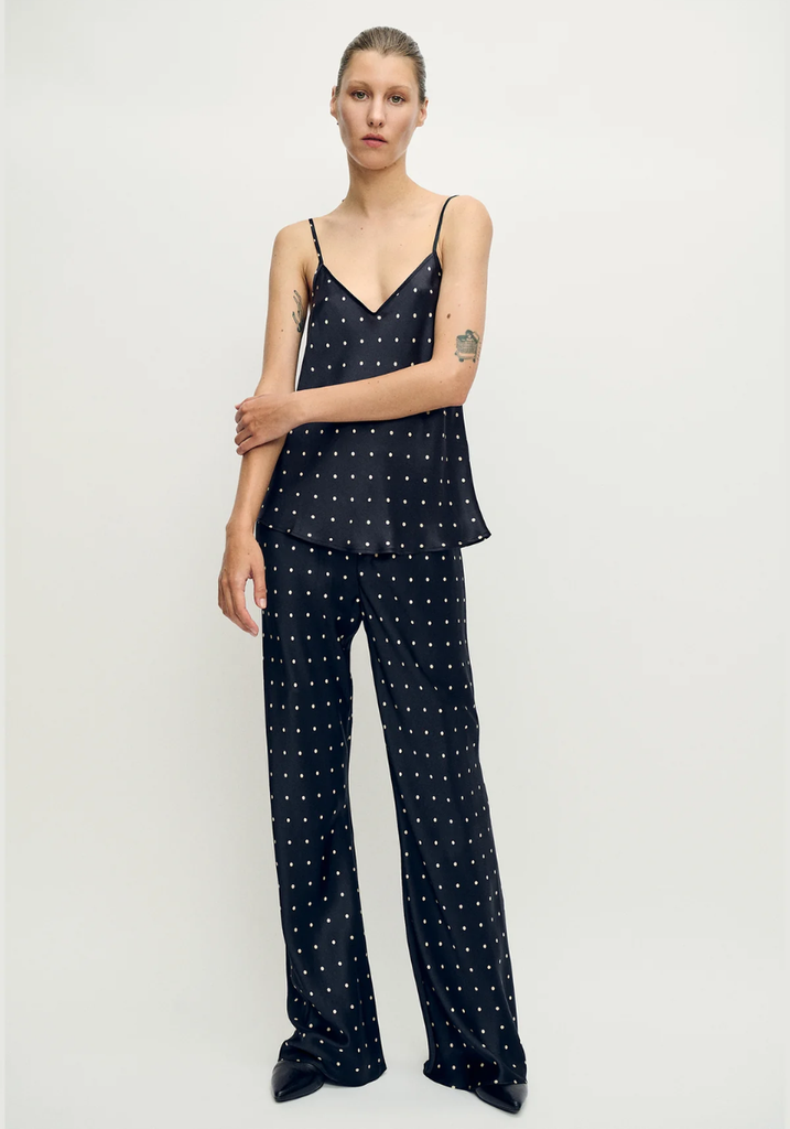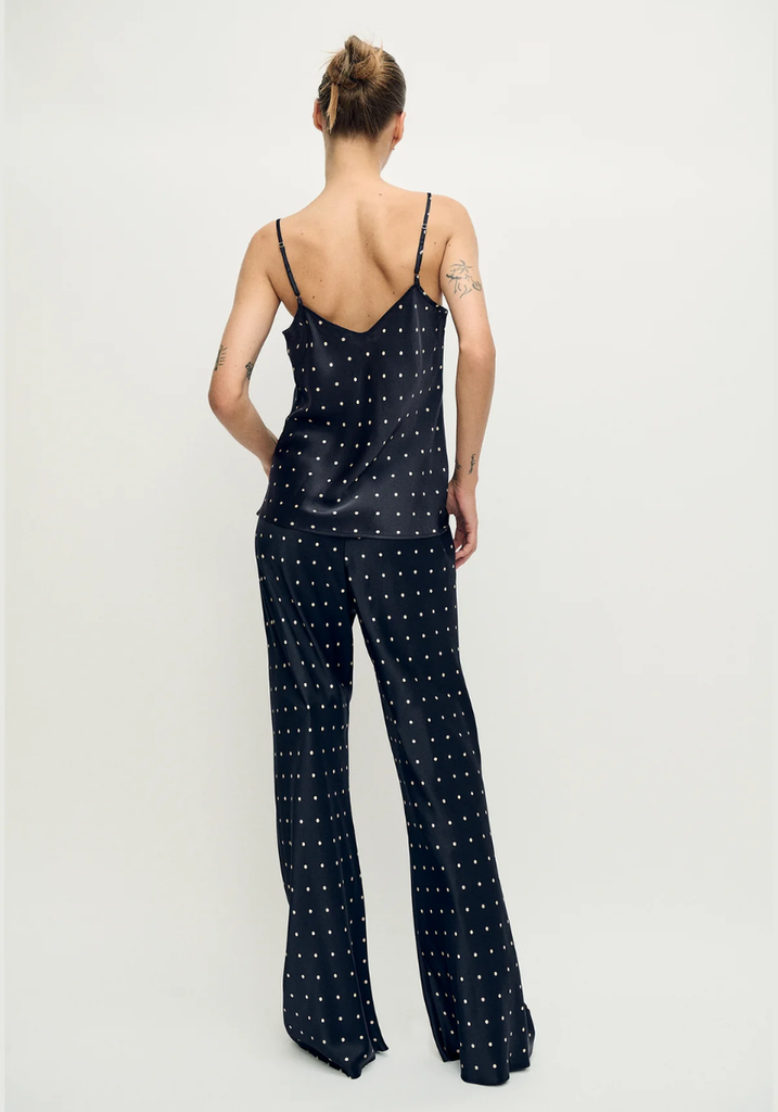 Silk Laundry Bias Cut Pants in Small Polka Dot are cut from 19MM silk satin with a high-waisted, elasticated fit. Designed on the bias with a glossy finish and internal French seams, featuring a classic hazelnut polka on black.