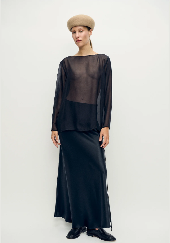 Silk Laundry's Chiffon Audrey Top is crafted from 8MM 100% Silk Chiffon, with a light, sheer finish and fluid drape. Designed with a clean neckline and refined silhouette, it sits softly on the body. A considered piece for layered styling and understated dressing.