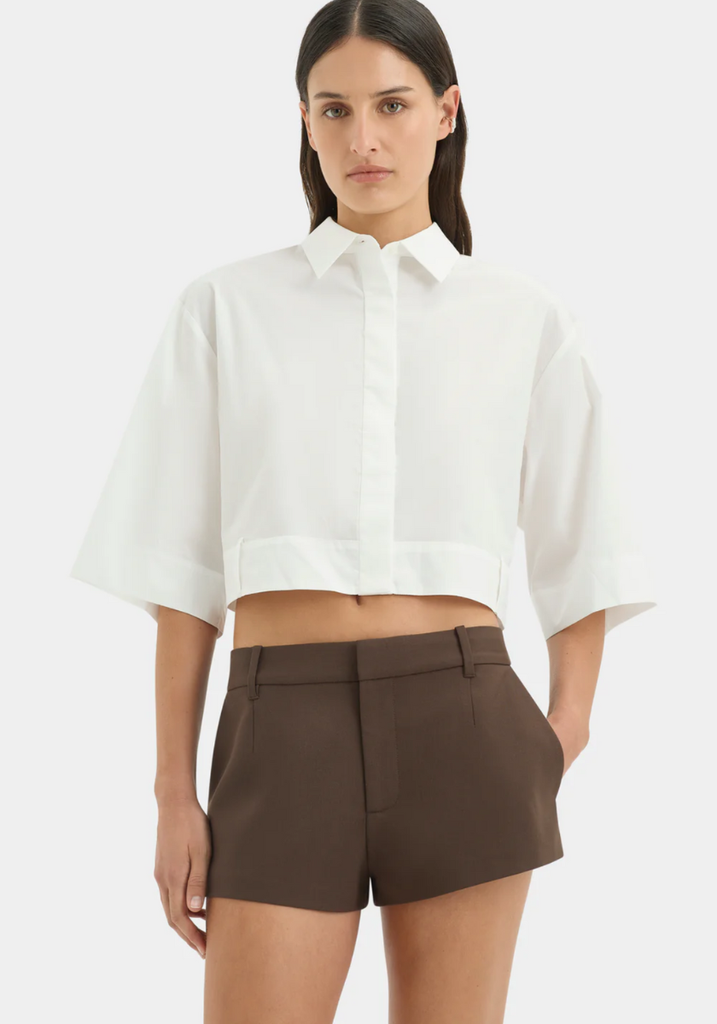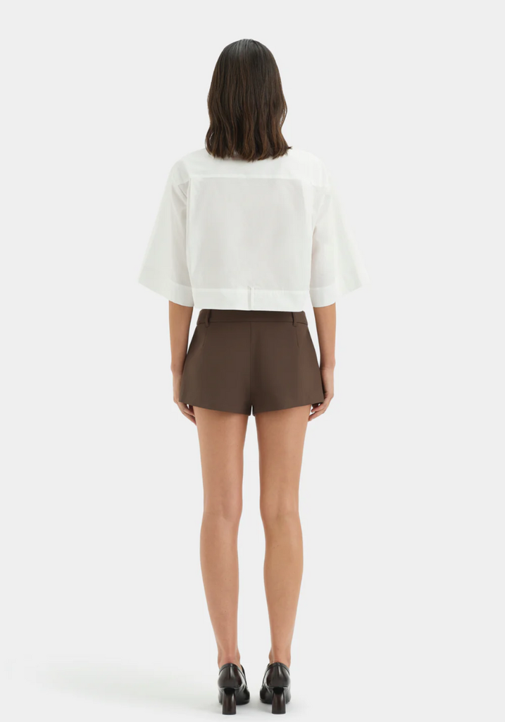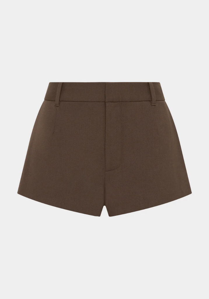 The Dylan Mini Short in Chocolate is a low to mid rise short, crafted from a wool-blend suiting fabrication with a smooth finish. A micro length silhouette, it features a relaxed shape, side pockets and belt loops for styling.