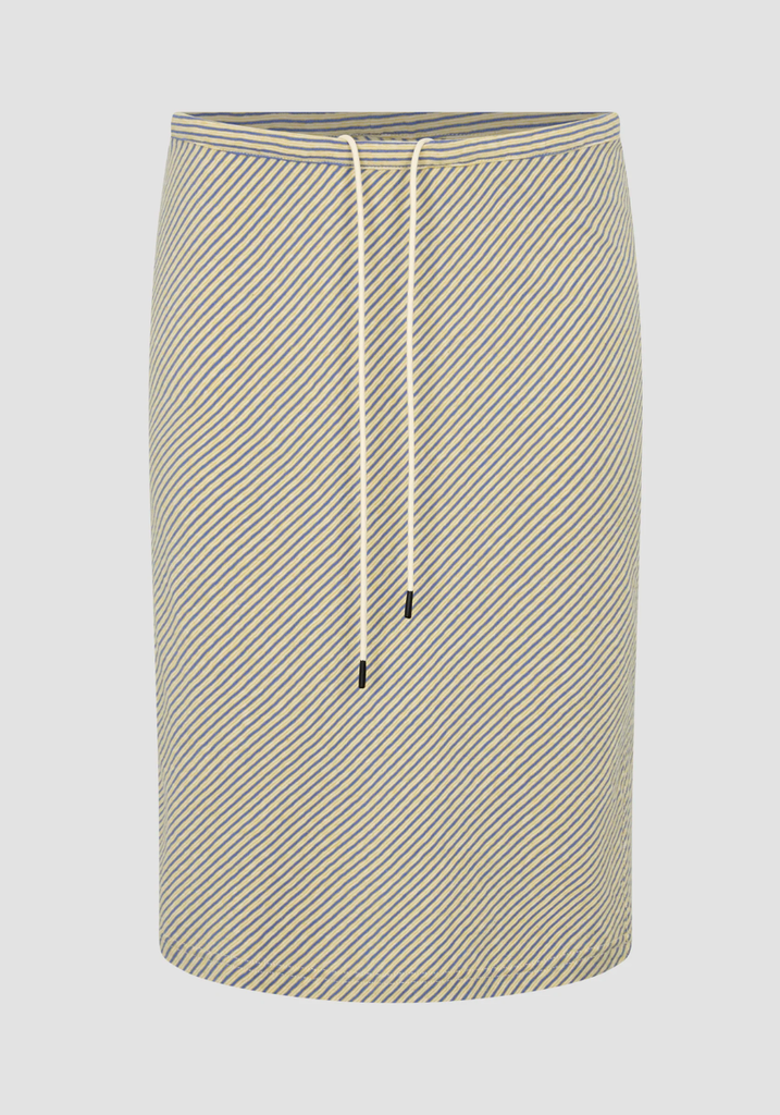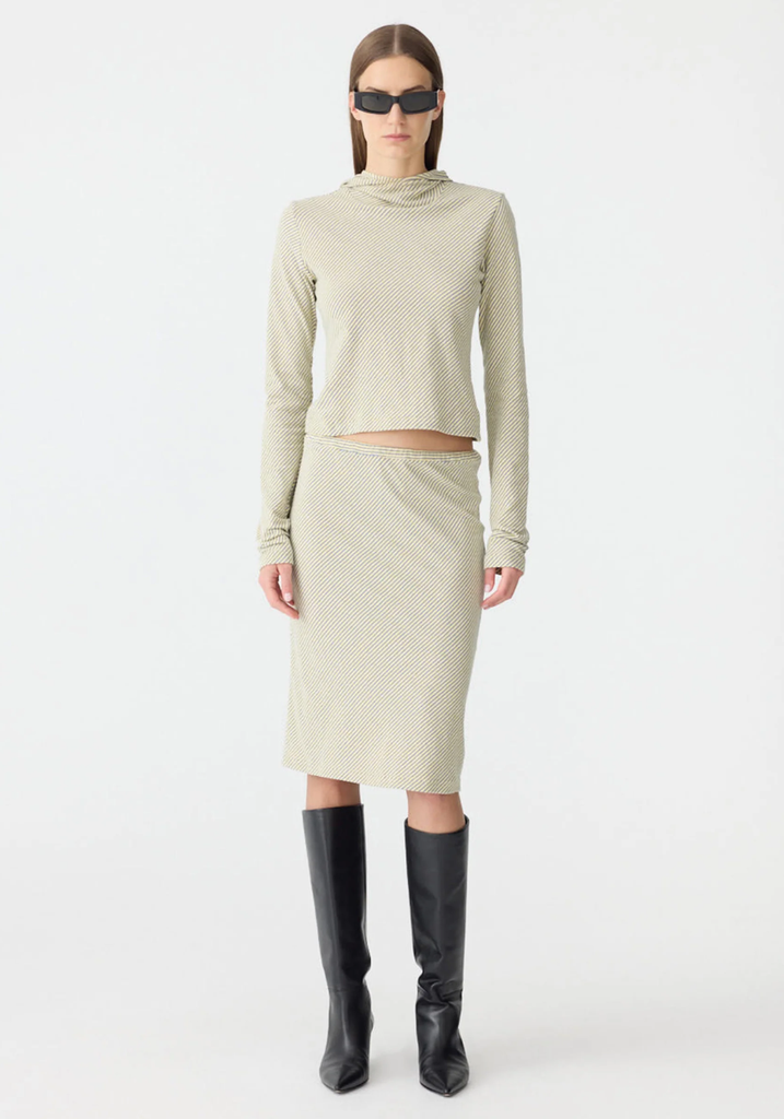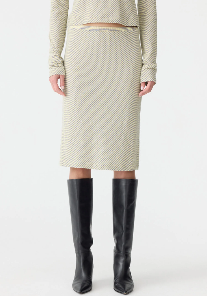 The Bias Stripe Skirt is a pull-on style crafted from Japanese cotton jersey, cut on the bias for a soft, fluid drape. Designed with an elasticated waistband and internal drawcord for ease, finished with a clean hem and subtle side seam detailing.