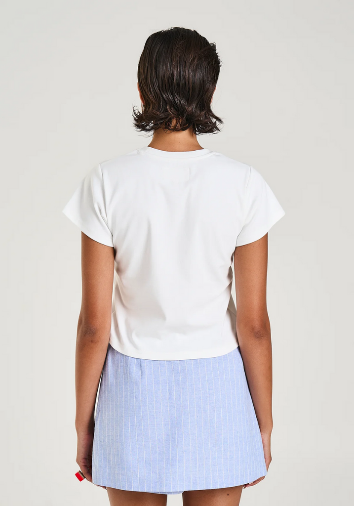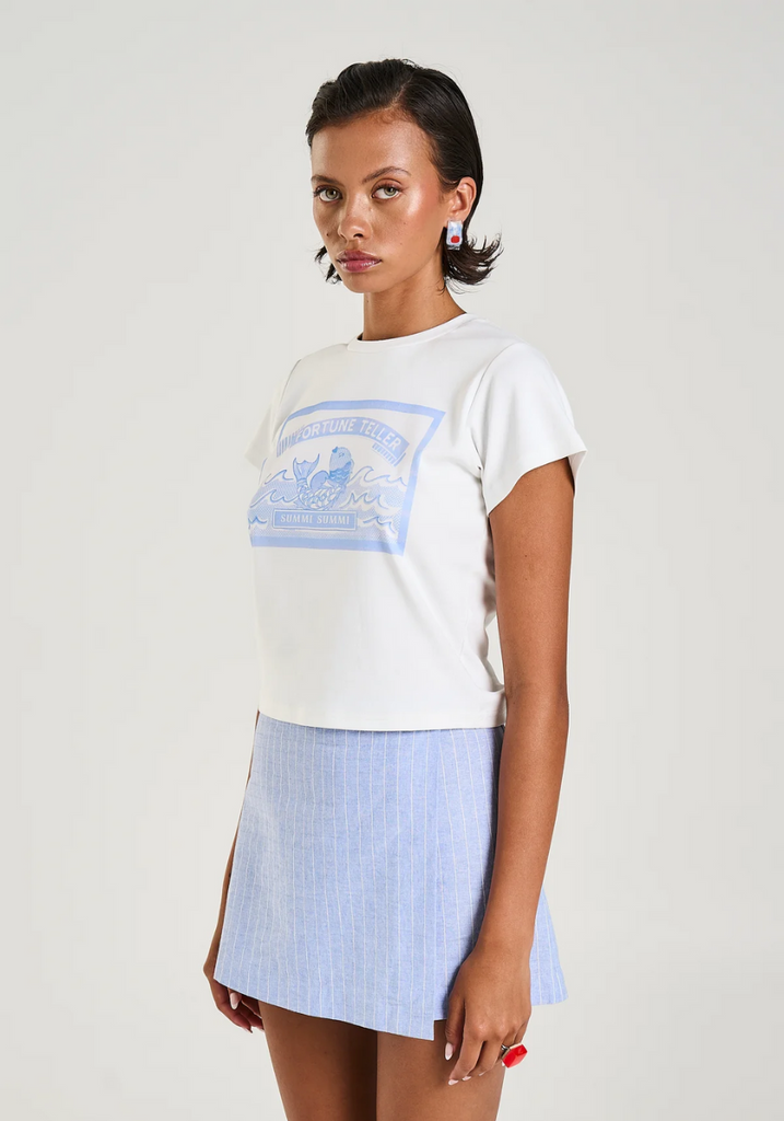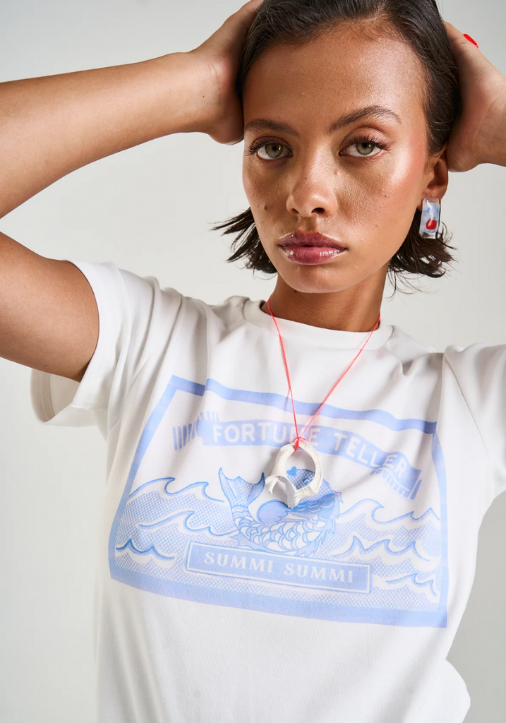 A classic white Baby Doll Tee elevated by the Summi Summi Fortune Teller Fish.