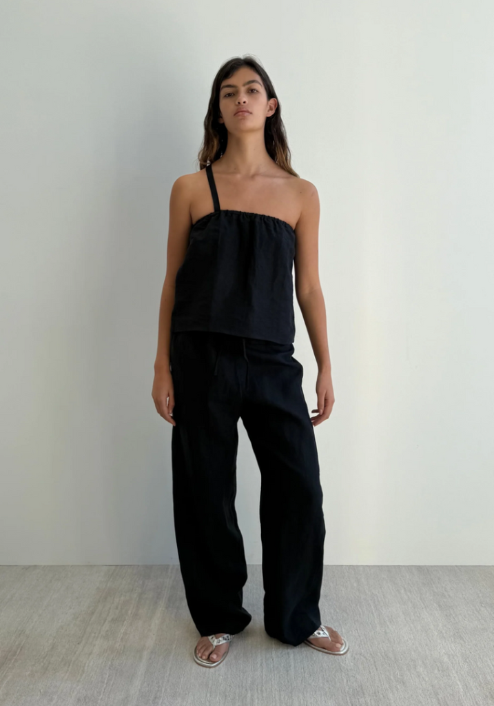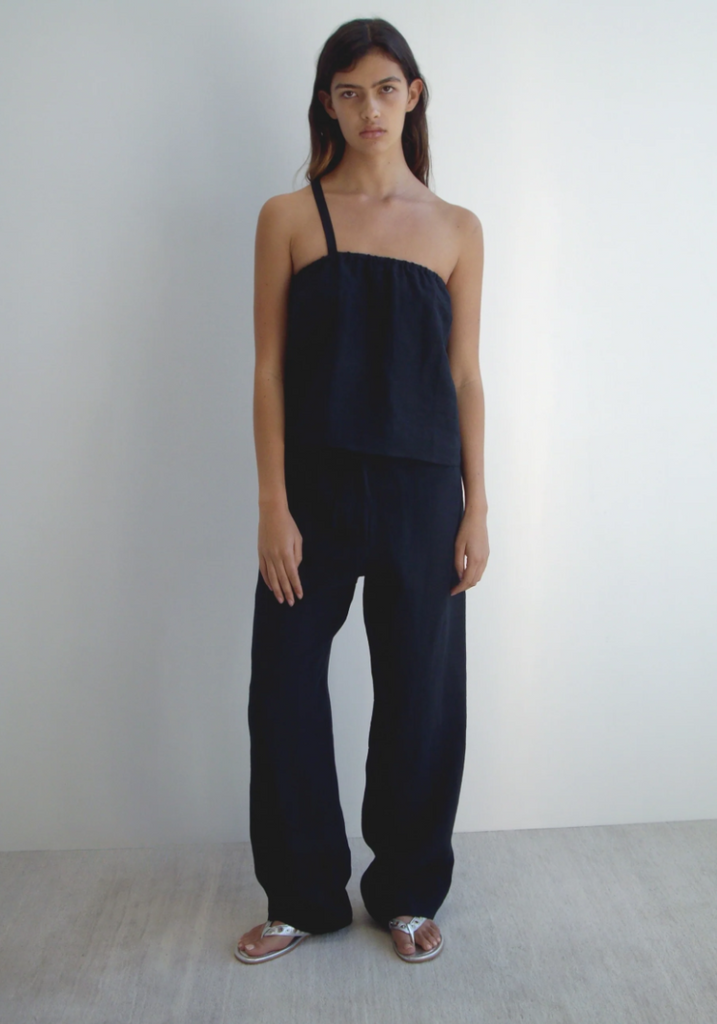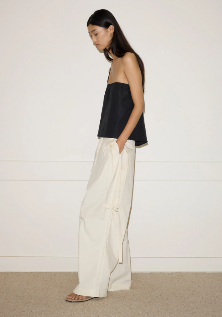 a straight-cut strapless top featuring an elasticated neckline and an asymmetric press-stud strap in a relaxed silhouette