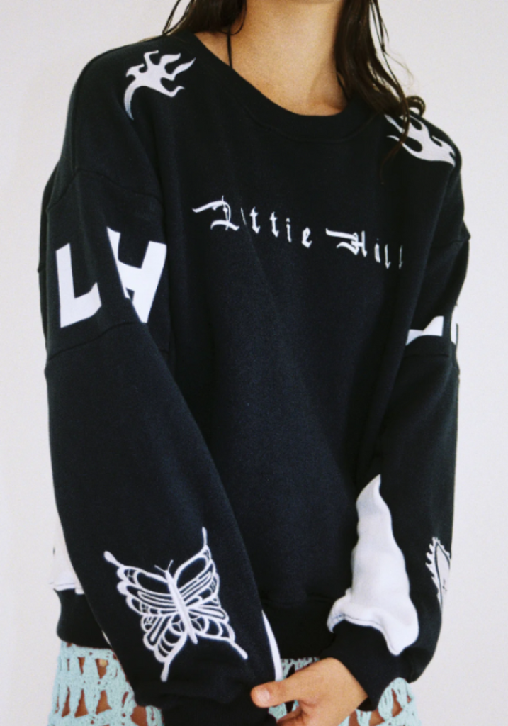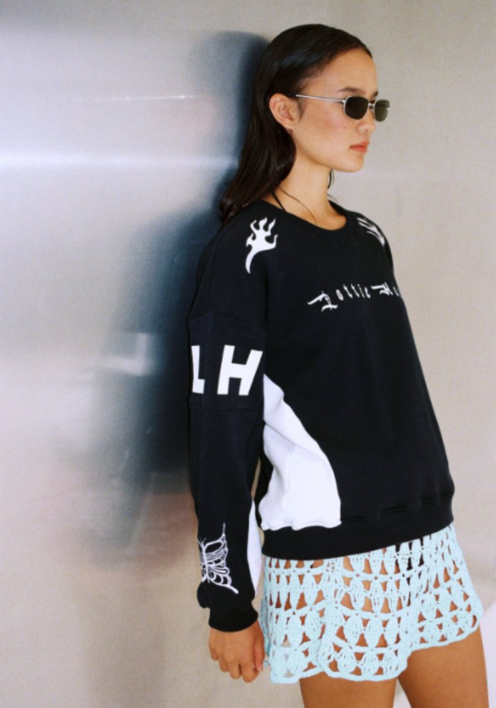 Be comfortable but more importantly be cool. A boxy, slouchy sweater with drop shoulders, rib sleeves and motor-cross inspired panelling, Lottie Hall embroidery and flame shoulders, heart and butterfly embroidery sleeves