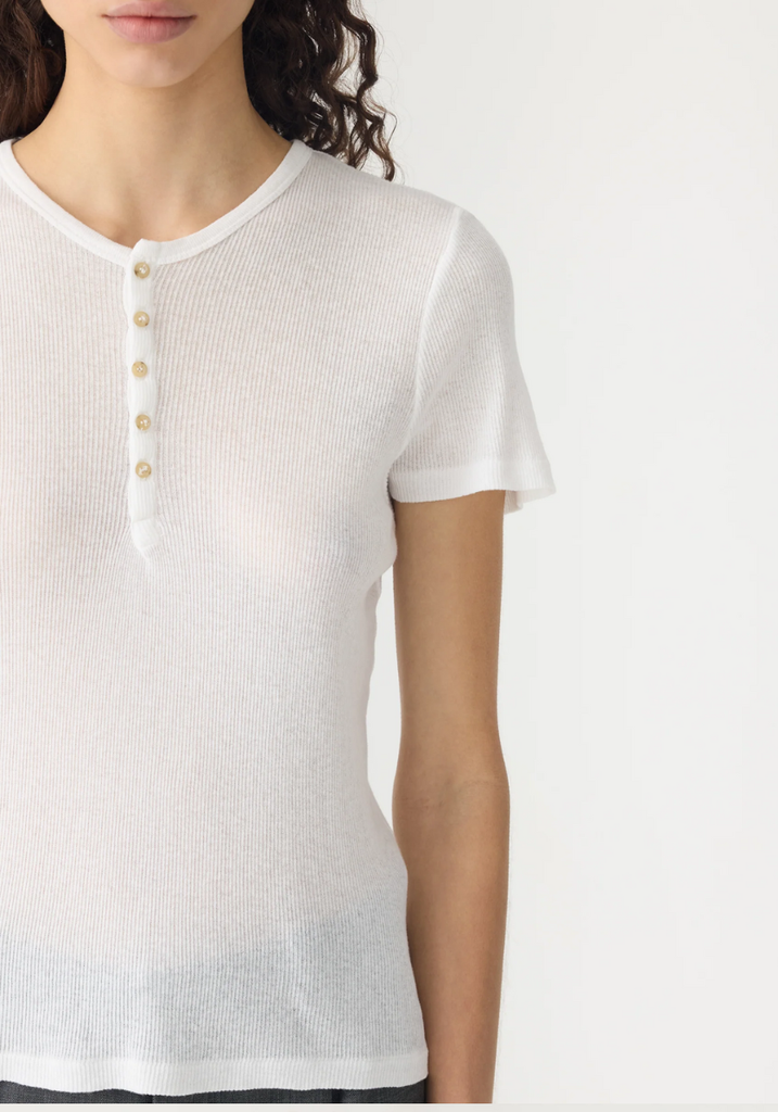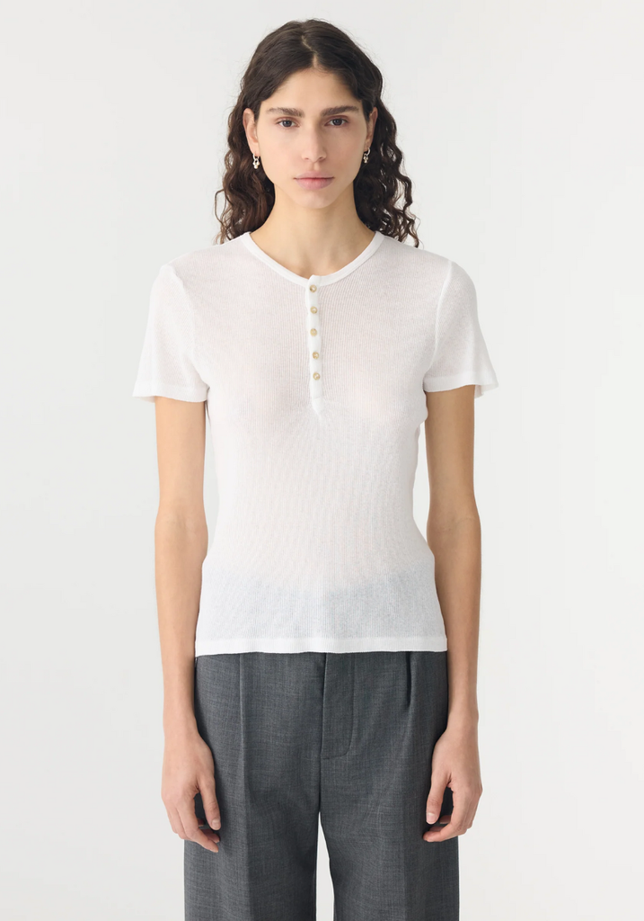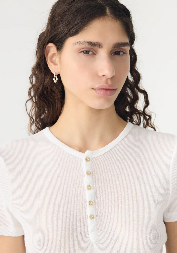 A new signature style, the Sheer Rib Placket Short Sleeve T-Shirt is designed for a slim fit in an organic sheer rib fabrication. This high-rotation staple features a quarter front placket with buttons, a ribbed neckline and finished hems. Complete with Bassike’s signature contrast chainstitch at the back neck.