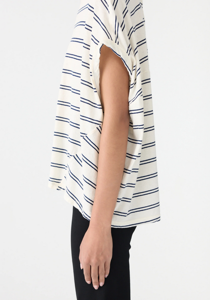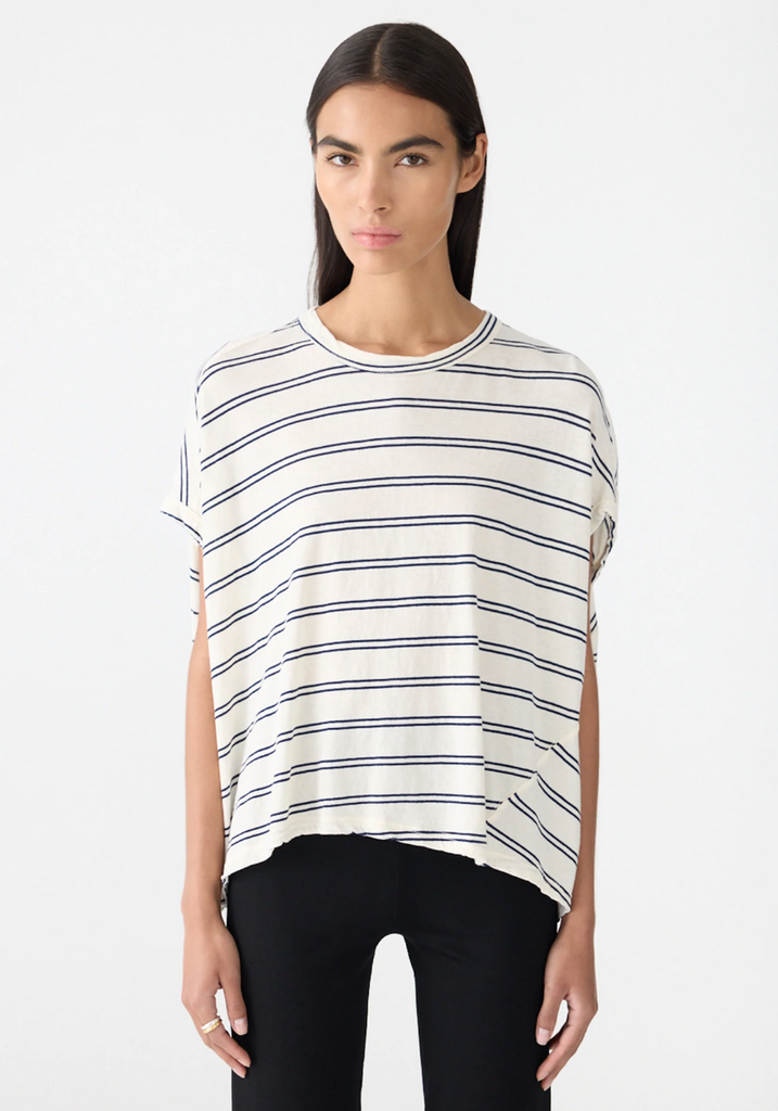 The Stripe Circle T-Shirt is a foundational wardrobe element relaxed by a subtle rounded silhouette. This redefined stripe relaxed tank boasts a curved hem detail and elongated capped sleeves. Refined by an open back detail with button closure. Complete with twisted side seams, oversized armholes and a heritage neck with bind.