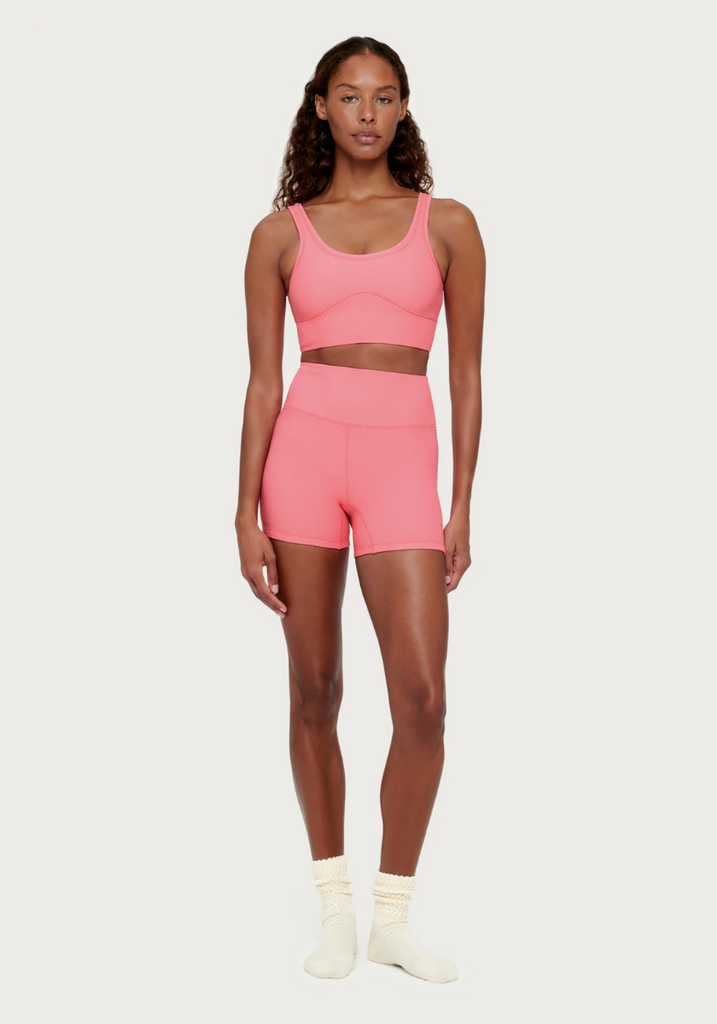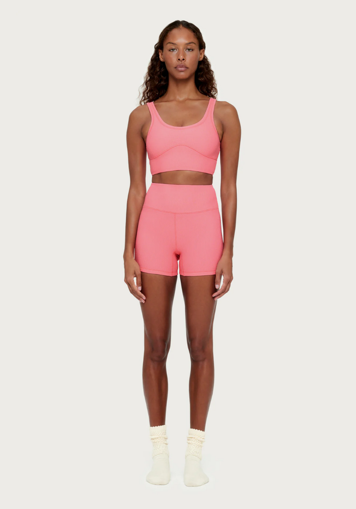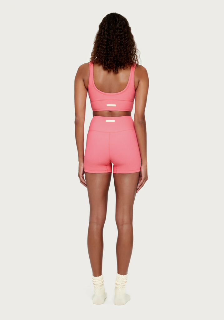 Made from a stretchy waffle-textured fabric with a dyed-to-match lining in a bright pink hue. Designed with a scoop neckline and a curved, elasticated hem band for natural support and comfort. Finished with slim straps and subtle shoulder binding for a clean, minimal look