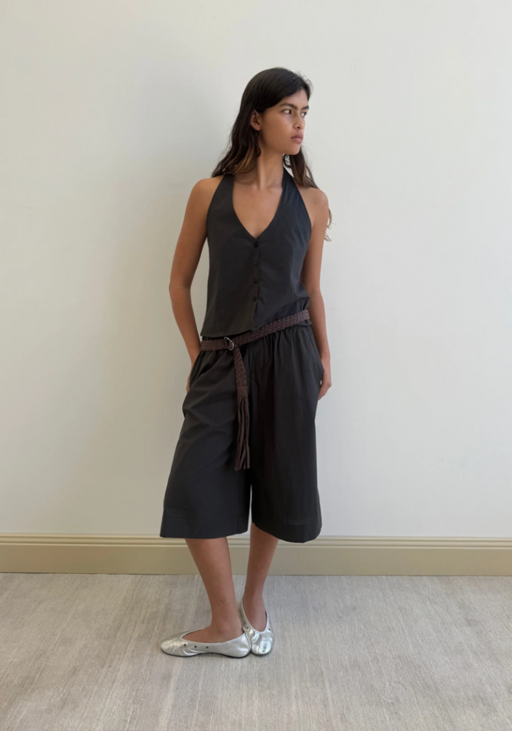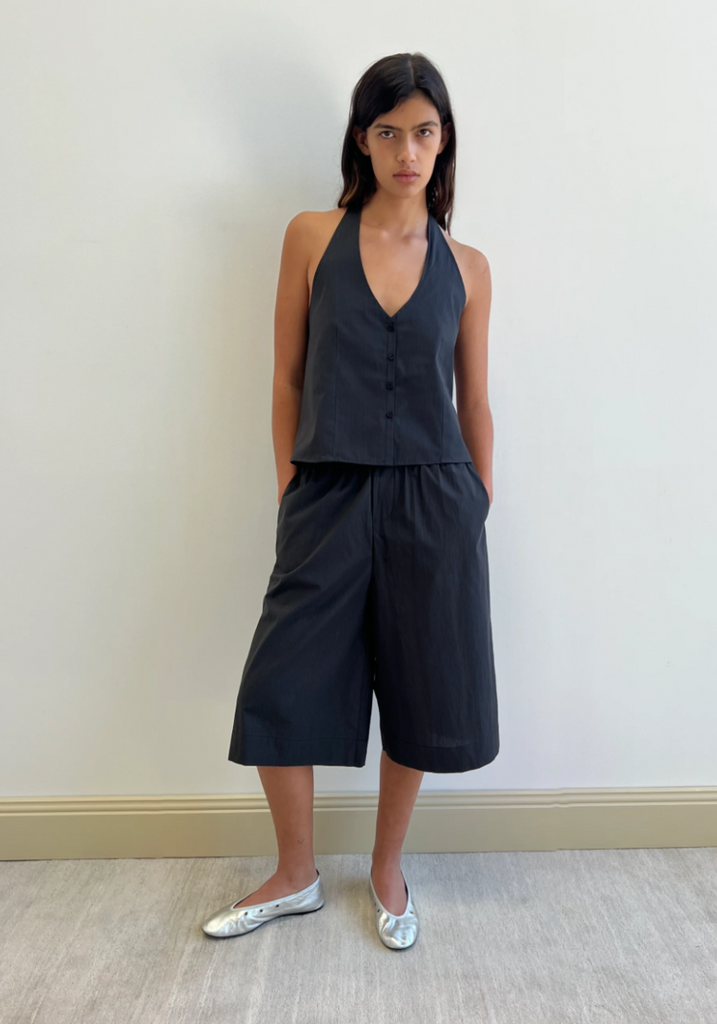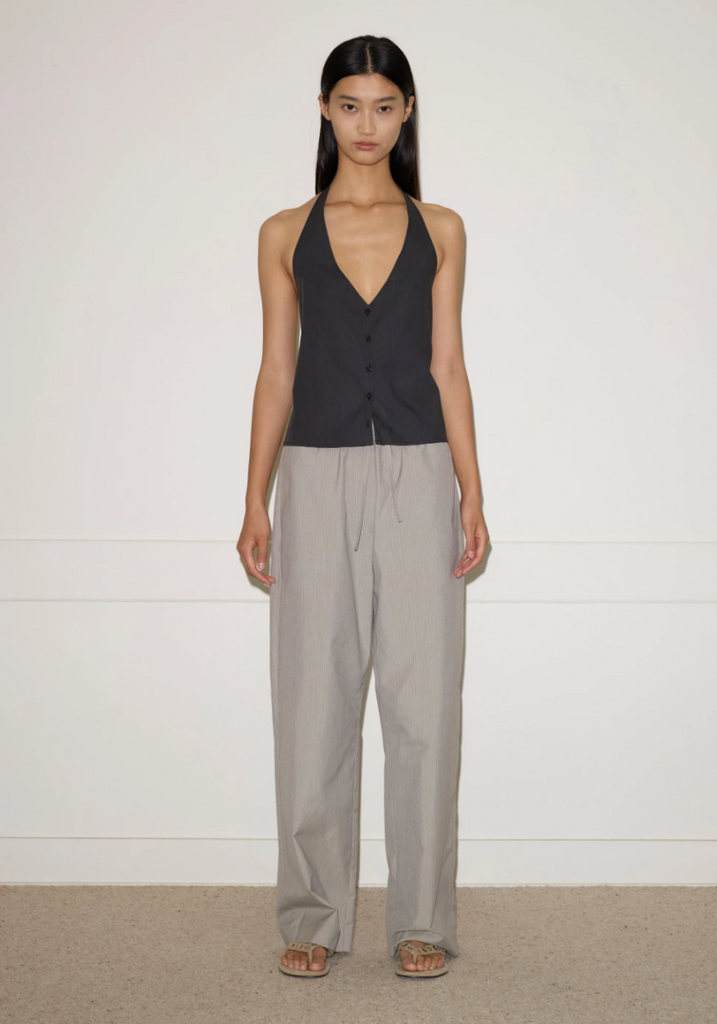 top features button front, halter neck tie and v neckline, bust seams for subtle shaping and shirred back