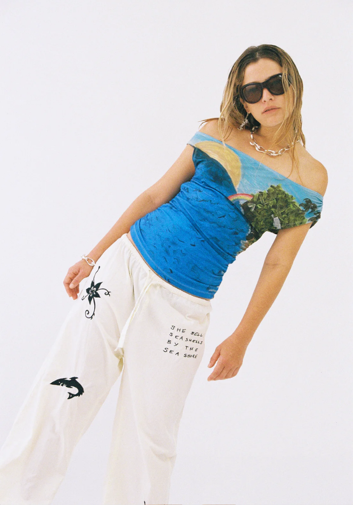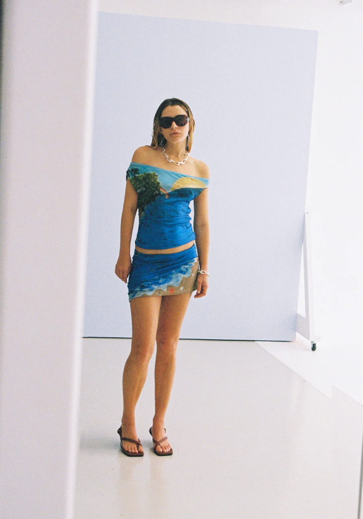 An off shoulder TOP in luxurious cotton bamboo stretch fabric, featuring gathered sides, and asymmetric neckline and sleeves. In Lotties latest ART PRINT "the BAY" digitally printed onto the fabric.