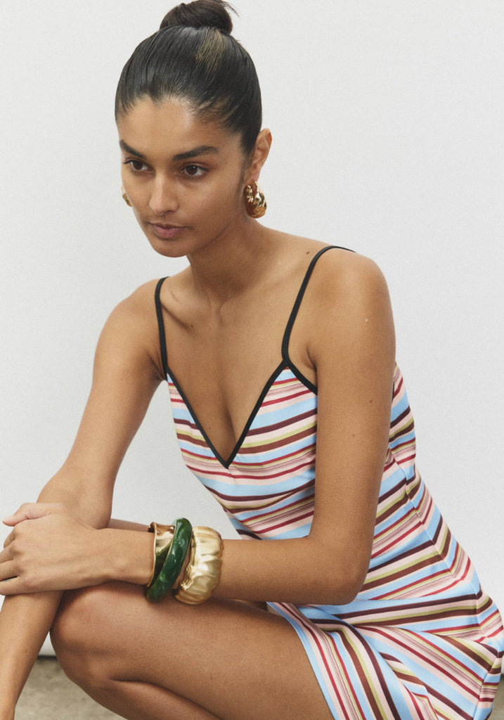 Discover our best-selling silhouette in the exclusive Vintage Stripe print. Cut on the bias for a perfect drape, this A-line design flatters the body effortlessly. Featuring striking colours, it’s the perfect throw-on dress for any occasion.