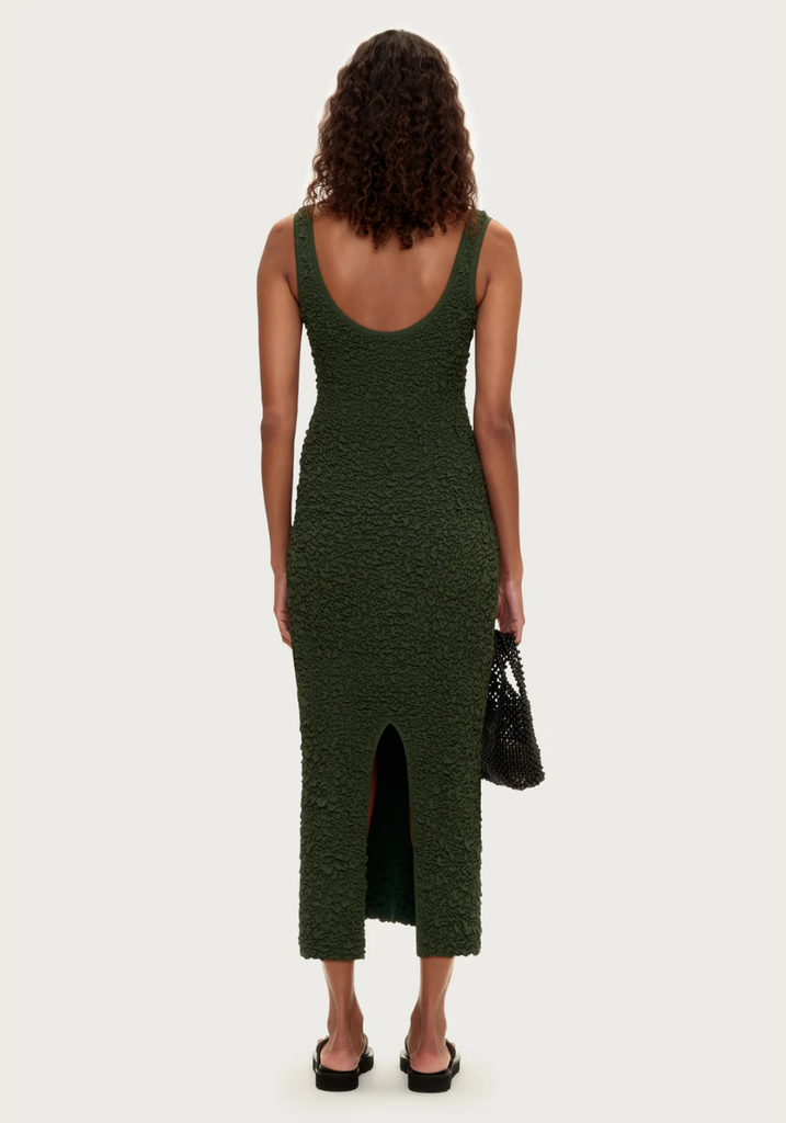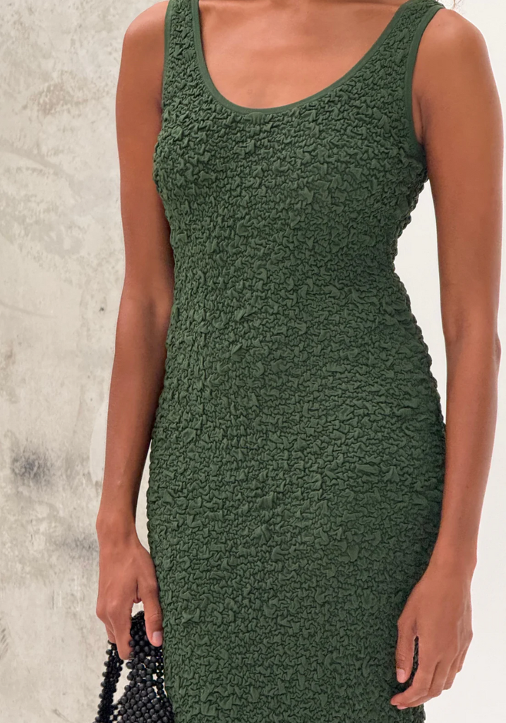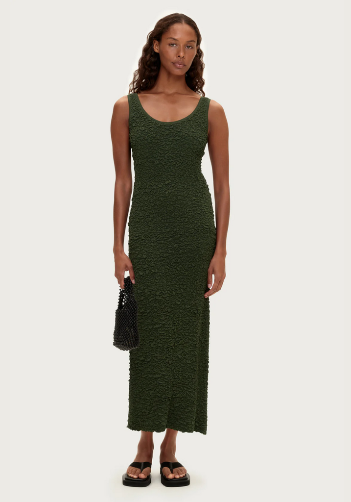 A sleeveless, slim fit maxi dress featuring soft scoop necklines at the front and back, made from a crinkled, dense textured fabric and finished with a rear centre hem split for an easy, resortwear look.