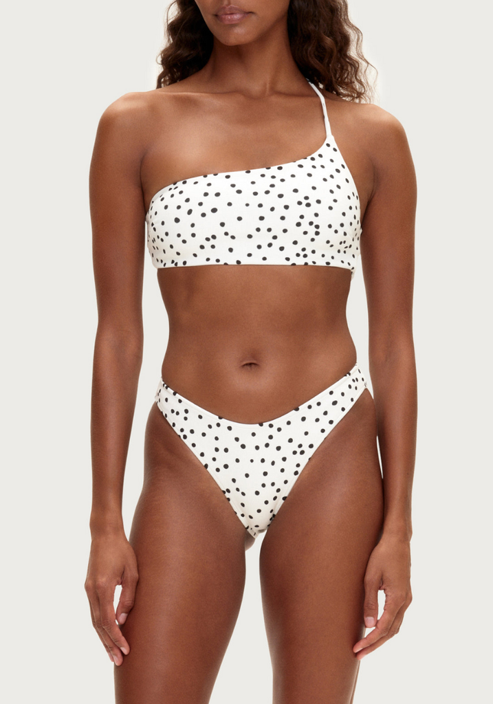 A curved bikini brief crafted from soft ribbed fabric in our custom spot print, finished with seamless dyed-to-match lining. Designed to sit high on the hip for a flattering, elongated silhouette.